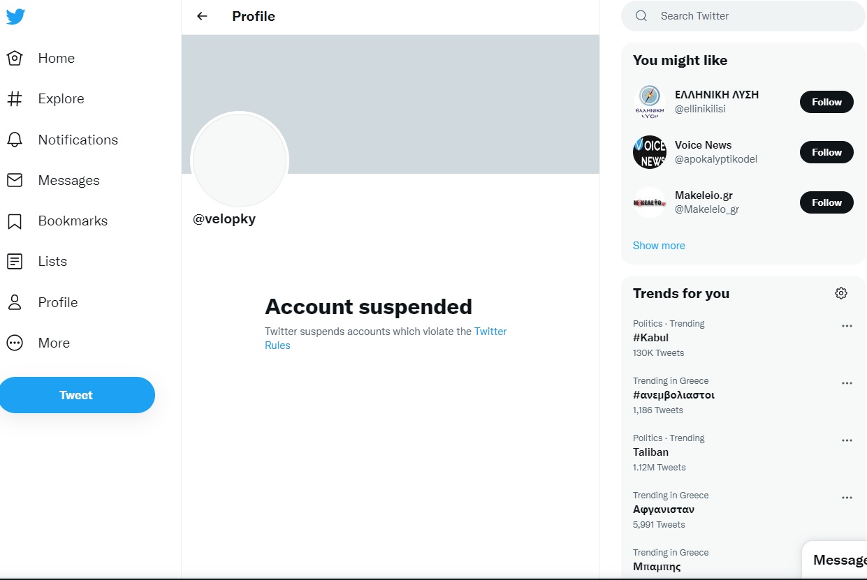 Στο προφίλ του, στο μέσο κοινωνικής δικτύωσης, αναγράφεται: «Ανασταλμένος λογαριασμός» με την υποσημείωση ότι « το Twitter, θέτει σε αναστολή λογαριασμούς που παραβιάζουν τους κανόνες».