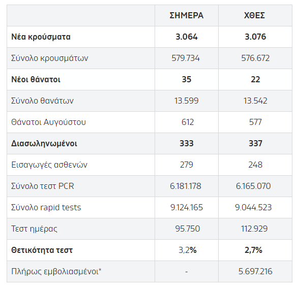 Οι νέοι θάνατοι ασθενών με COVID-19 είναι 35, ενώ από την έναρξη της επιδημίας έχουν καταγραφεί συνολικά 13.599 θάνατοι.