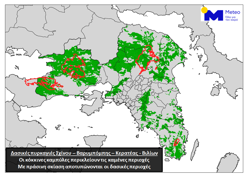 Το 16% των δασών της ηπειρωτικής Αττικής κάηκαν κατά τις πυρκαγιές σε Σχίνο, Βαρυμπόμπη, Κερατέα και Βίλια, σύμφωνα με ανάλυση του Εθνικού Αστεροσκοπείου Αθηνών/meteo.gr.