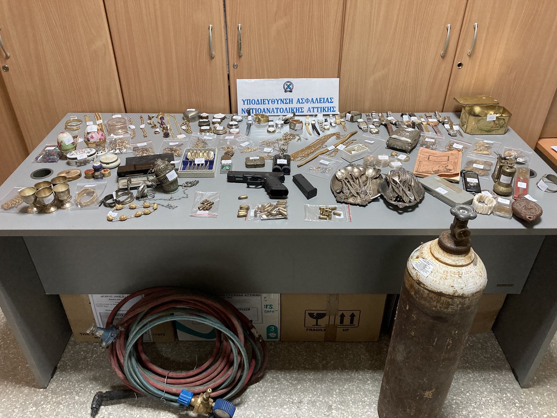 Κατασχέθηκαν ένα (1) λειτουργικό πυροβόλο όπλο (πιστόλι) μάρκας GLOCK , το οποίο είχε κλαπεί το έτος 2015, πλήθος φυσιγγίων πυροβόλων όπλων διαφόρων διαμετρημάτων, ένα (1) πλήρες σύστημα οξυγονοκόλλησης για τη διάνοιξη χρηματοκιβωτίων, μεγάλος αριθμός κοσμημάτων και χρυσαφικών, συσκευές κινητής τηλεφωνίας, χρησιμοποιημένες κάρτες sim καθώς και πέντε (5) φιαλίδια με χημική ουσία για την ανίχνευση περιεκτικότητας χρυσού.