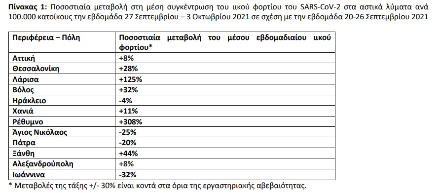 Την εβδομάδα 27 Σεπτεμβρίου έως 3 Οκτωβρίου 2021, παρατηρήθηκαν αυξητικές τάσεις, σε σχέση με την εβδομάδα 20 έως 26 Σεπτεμβρίου 2021, στο μέσο εβδομαδιαίο ιικό φορτίο του SARS-CoV-2 στα αστικά λύματα των έξι από τις δώδεκα (6/12) περιοχές που ελέγχθηκαν από το Εθνικό Δίκτυο Επιδημιολογίας Λυμάτων (ΕΔΕΛ) του ΕΟΔΥ. Καθαρά αυξητικές τάσεις παρατηρήθηκαν στην Ξάνθη (+44%), στη Λάρισα (+125%) και στο Ρέθυμνο (+308%), ενώ οριακές ήταν οι αυξήσεις που παρατηρήθηκαν στα Χανιά (+11%), στη Θεσσαλονίκη (+28%) και στο Βόλο (+32%).