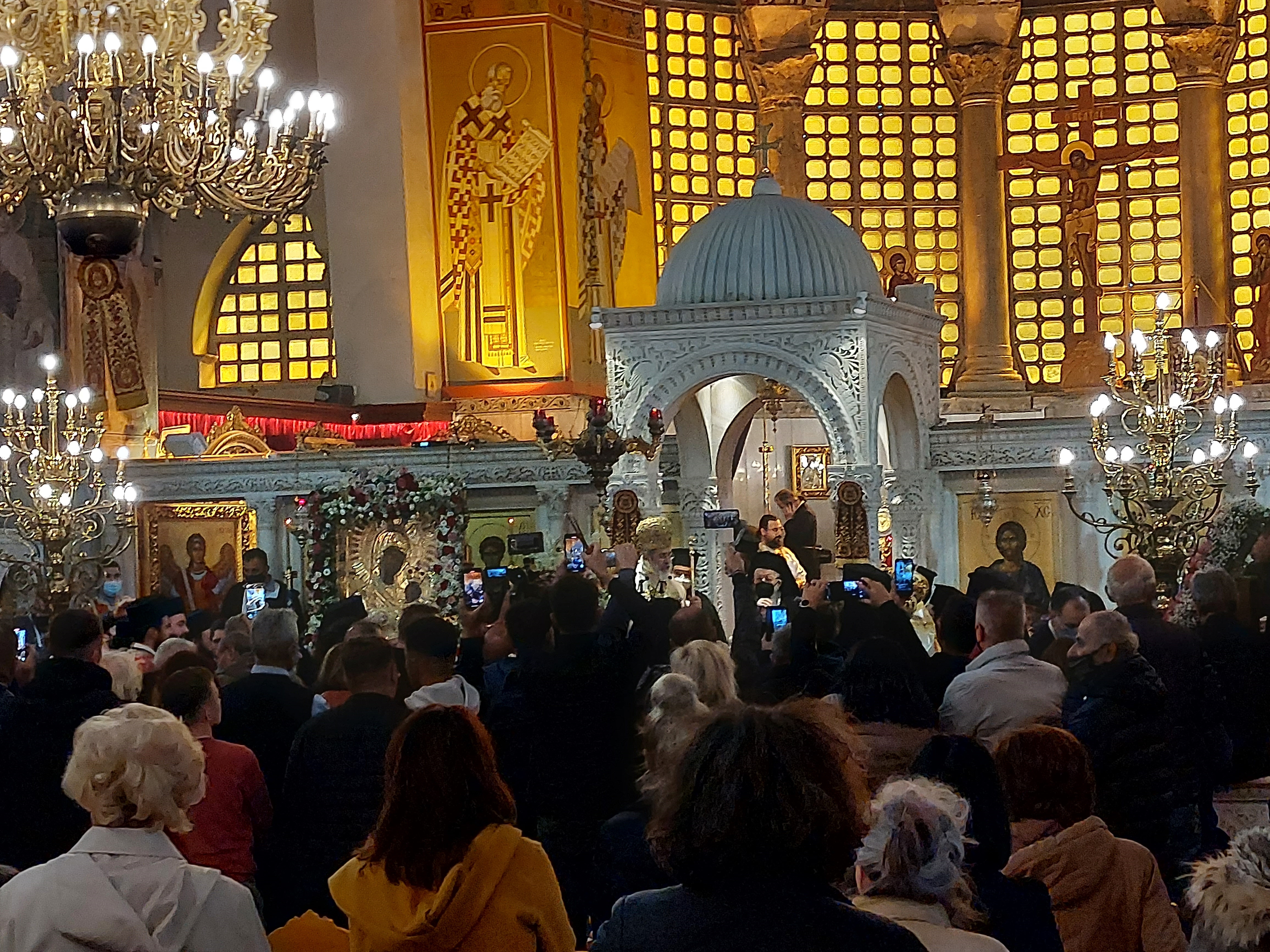 Η λιτάνευση έγινε παρουσία πλήθους πιστών που ακολούθησαν την πομπή, υπό τους ήχους φιλαρμονικής και κωδωνοκρουσιών. Λίγο μετά, εκατοντάδες πιστοί συνωστίστηκαν στο δεξιό κλίτος στο εσωτερικό του ναού, περιμένοντας τη σειρά τους για το προσκύνημα των λειψάνων και των εικόνων.