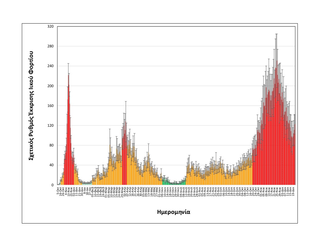 Όπως αποτυπώνεται στα διαγράμματα που παρουσιάζει το ΑΠΕ-ΜΠΕ, μετά από τρεις εβδομάδες έχει ανακοπεί η ήπια αποκλιμάκωση του ιικού φορτίου, που είχε διαρκέσει τρεις εβδομάδες μετά το σημείο κορύφωσης του τέταρτου κύματος την 25η Νοεμβρίου.