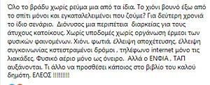 Ουδέν κακό, αμιγές καλού όμως, καθώς «όλα αυτά έγιναν αφορμή για συμπόνια προς τον τόπο μας, έγιναν αφορμή να ενωθεί ο κόσμος. Ήρθαν στη συζήτηση θέματα που μας ταλαιπωρούν, όπως η Ασφάλεια της ζωής κ της περιουσίας μας, η δασοπροστασία, οι τεράστιες ευθύνες της Δημοτικής αρχής, αλλά και η ευθύνη που αναλογεί στον καθένα μας».