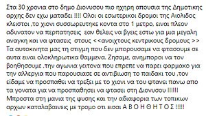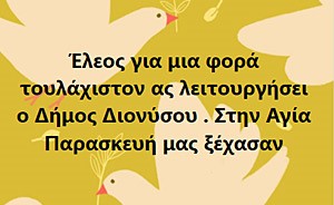 Όλα τα παραπάνω θα μπορούσαν κάλλιστα να αποτελέσουν την θεματολογία ενός καλού νούμερου σε μια επιθεώρηση. Όμως όπως και να έχει δυστυχώς, αποτελούν πρωτίστως την επίσημη εικόνα του Δήμου Διονύσου του Δήμου που τους τελευταίους 11 μήνες ξόδεψε 4.000.000 για πολιτική προστασία με απευθείας αναθέσεις σε κολλητούς και κουμπάρους», καταλήγει η ανακοίνωση.