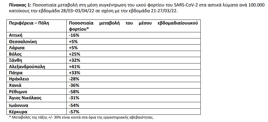 Την εβδομάδα 28 Μαρτίου έως 3 Απριλίου 2022 παρατηρήθηκαν αυξητικές τάσεις, σε σχέση με την εβδομάδα 21 έως 27 Μαρτίου 2022, στο μέσο εβδομαδιαίο ιικό φορτίο του SARS-CoV-2 στα αστικά λύματα σε τέσσερις από τις δεκατρείς περιοχές που ελέγχθηκαν από το Εθνικό Δίκτυο Επιδημιολογίας Λυμάτων (ΕΔΕΛ) του ΕΟΔΥ, πτωτικές τάσεις σε επτά από τις δεκατρείς περιοχές του ΕΔΕΛ και σταθεροποιητικές τάσεις σε δύο από τις δεκατρείς περιοχές που ελέγχθηκαν από το ΕΔΕΛ.