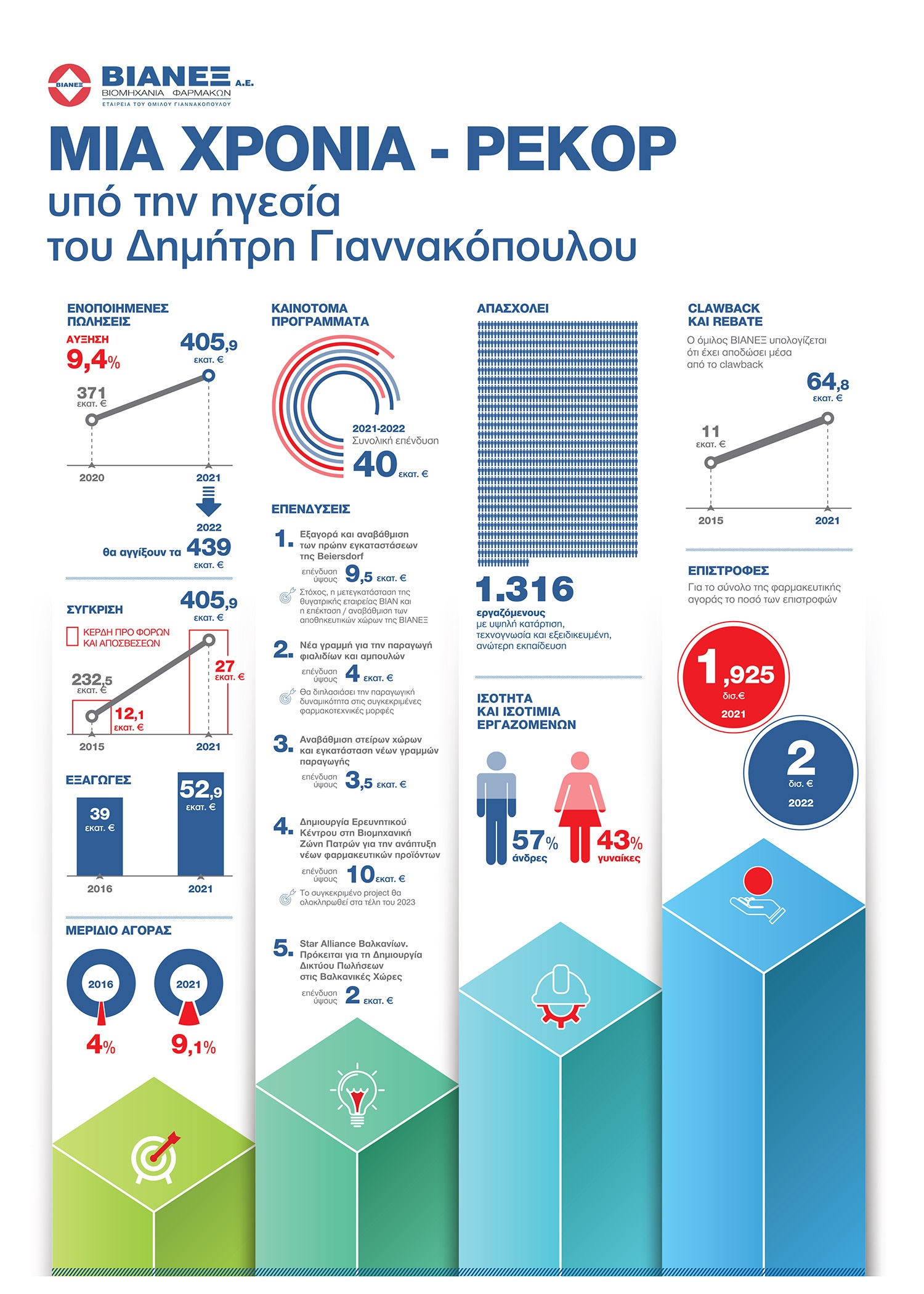 «Σε μια δύσκολη εποχή, γεμάτη προκλήσεις στην παγκόσμια κοινότητα, η εταιρεία μας κατάφερε να ξεπεράσει τους στόχους της και να δικαιώσει τη φήμη της ως η κορυφαία ελληνική φαρμακοβιομηχανία. Όλη η οικογένεια της ΒΙΑΝΕΞ, διοίκηση και εργαζόμενοι, νιώθουμε υπερήφανοι για τα φετινά αποτελέσματα της επιχειρηματικής μας στρατηγικής. Ταυτόχρονα, είμαστε πιο δυνατοί και έτοιμοι για το μέλλον, ενώ μέσα από στρατηγικές επενδύσεις, θέτουμε ακόμα πιο γερές βάσεις για τη μακροπρόθεσμη ανάπτυξη της εταιρείας μας. Θέλω να σημειώσω τέλος, ότι δεδομένων των αποτελεσμάτων μας, προφανώς και το τίμημα του Ομίλου ΒΙΑΝΕΞ σε clawback και rebate είναι πολύ μεγάλο. Ωστόσο, δε σταματήσαμε να επενδύουμε τόσο στους ανθρώπους μας, αυξάνοντας το δυναμικό μας, όσο και στην κοινωνία εν γένει, απαντώντας σταθερά στις ανάγκες της, επεκτείνοντας τα προγράμματα και τη προσφορά μας από άκρη σε άκρη της Ελλάδας».