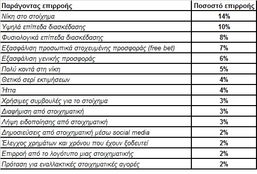 Οι συμμετέχοντες ερωτήθηκαν ποιον από τους παραπάνω παράγοντες επιρροής βίωσαν κατά την τελευταία τους αλληλεπίδραση με το στοίχημα και σε ποιο βαθμό ο καθένας τους ενθάρρυνε να συνεχίσουν την ενασχόληση. Το ποσοστό επίδρασης υπολογίστηκε χρησιμοποιώντας την ακόλουθη εξίσωση: