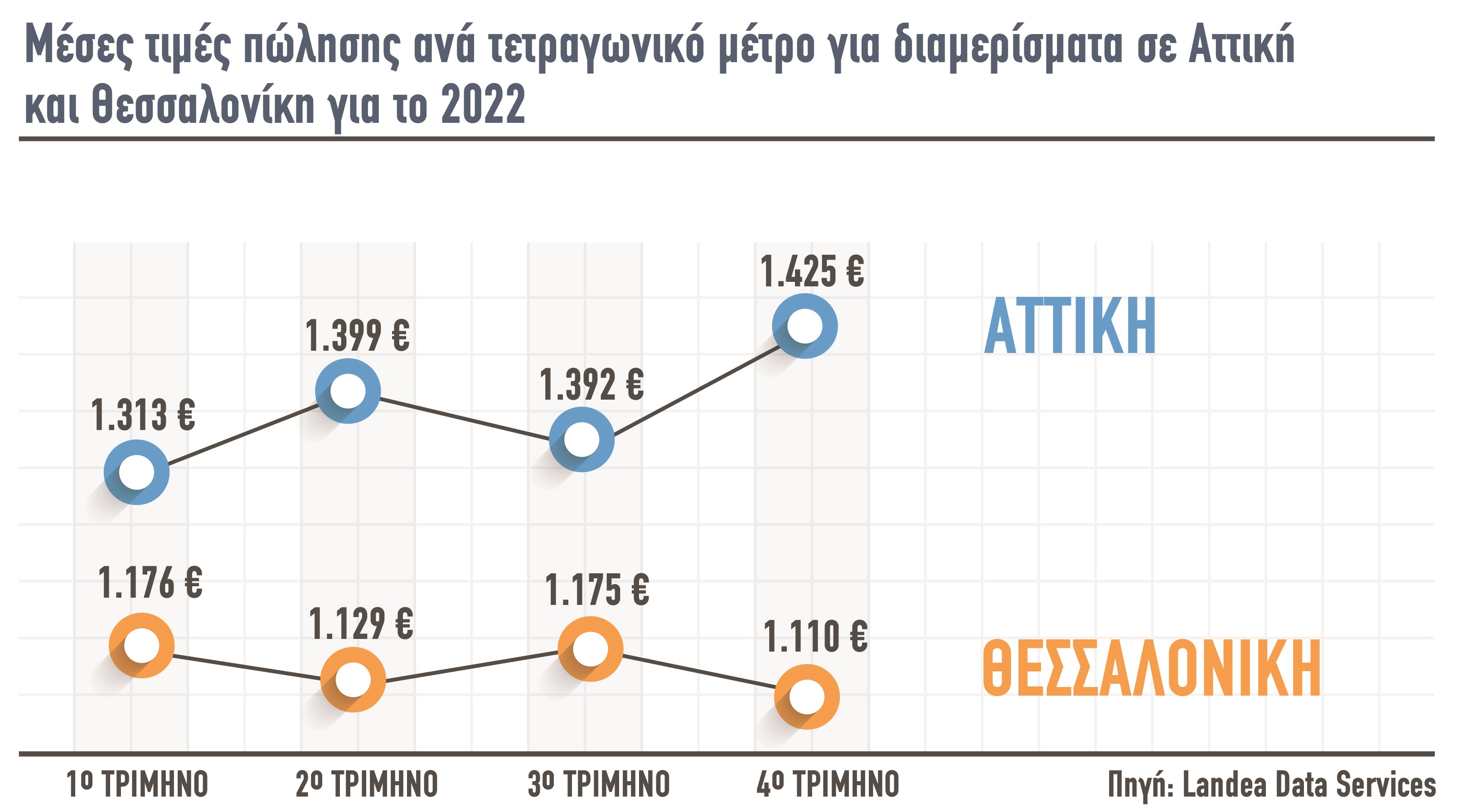 Επιπλέον για ολοκληρωμένες πωλήσεις μέσω πλειστηριασμού διαμερισμάτων στην Αττική μέσα στο 2022, η μέση τιμή πώλησης ανά τετραγωνικό μέτρο αυξήθηκε από 1.313€ σε 1.425€ που αντιστοιχεί σε αύξηση 8,5%. Αντίθετα για τον νομό Θεσσαλονίκης υπήρξε πτώση 5,6% καθώς από τα 1.176€ έπεσε στα 1.110€ (παρακάτω γράφημα)