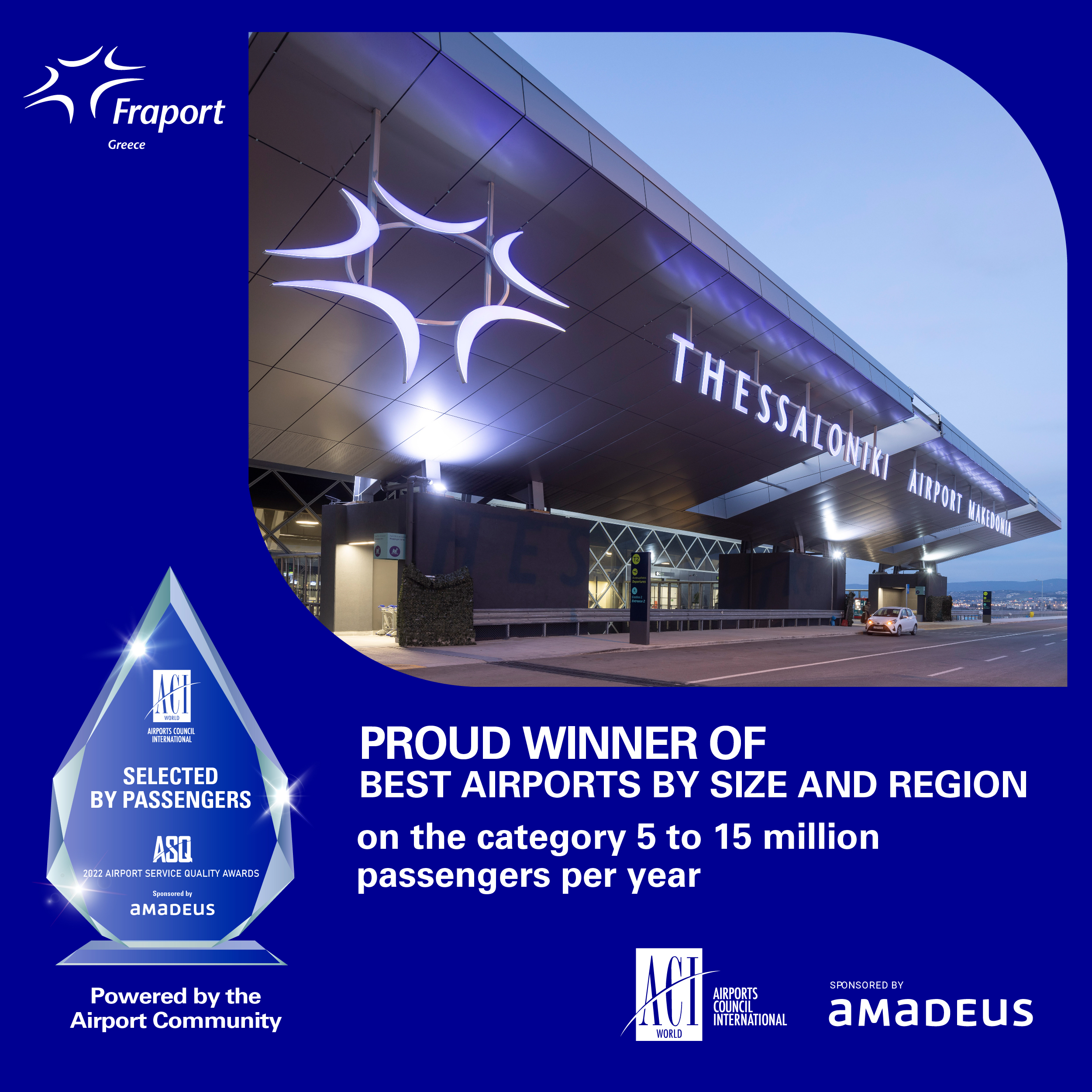 Σε αυτό το πλαίσιο, η Fraport Greece διακρίθηκε στα διεθνή βραβεία «2022 Airport Service Quality (ASQ) Awards», με το αεροδρόμιο «Μακεδονία» να αναδεικνύεται ως ένα από τα κορυφαία αεροδρόμια στην Ευρώπη, στην κατηγορία των αερολιμένων που διαχειρίζονται 5 έως 15 εκατομμύρια επιβάτες το χρόνο. Πιο συγκεκριμένα, τα ASQ Awards είναι μέρος του παγκόσμιου προγράμματος αξιολόγησης αεροδρομίων του Airports Council International (ACI), παρουσιάζοντας, κάθε χρόνο, τα κορυφαία αεροδρόμια παγκοσμίως.