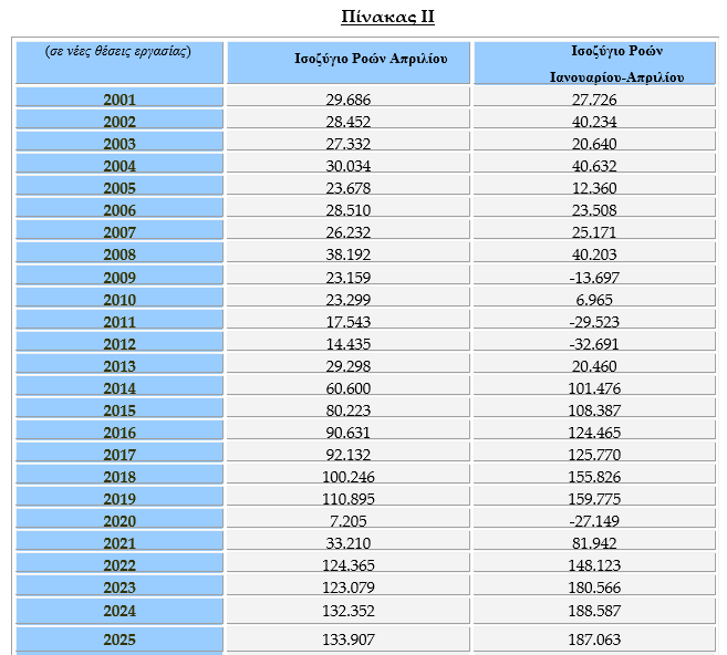 Θα πρέπει να επισημανθεί ότι το ισοζύγιο ροών απασχόλησης του μηνός Απριλίου καταγράφεται πάντα θετικό και επιπλέον η επίδοση του Απριλίου 2025 είναι η υψηλότερη καταγεγραμμένη θετική επίδοση ισοζυγίου μηνός Απριλίου από το 2001 μέχρι σήμερα.