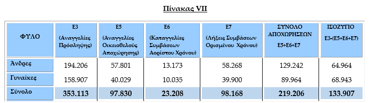 Συγκεκριμένα, σύμφωνα με τα στοιχεία των ροών μισθωτής απασχόλησης του Απριλίου 2025, οι αναγγελίες πρόσληψης ανήλθαν σε 353.113, ενώ οι αποχωρήσεις σε 219.206. Από τις 219.206 συνολικά αποχωρήσεις, οι 97.830 προήλθαν από οικειοθελείς αποχωρήσεις και οι 121.376 από καταγγελίες συμβάσεων αορίστου χρόνου ή λήξεις συμβάσεων ορισμένου χρόνου.