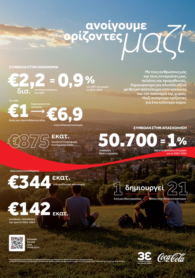 Η εταιρεία συνεισφέρει επίσης €875 εκατ. στα δημόσια έσοδα, που ισοδυναμούν με το 1,2% των συνολικών φορολογικών εσόδων του κράτους, ενώ τα ελληνικά νοικοκυριά επωφελούνται από εισόδημα €344 εκατ. που προκύπτει από την αλυσίδα αξίας της Coca-Cola στην Ελλάδα.