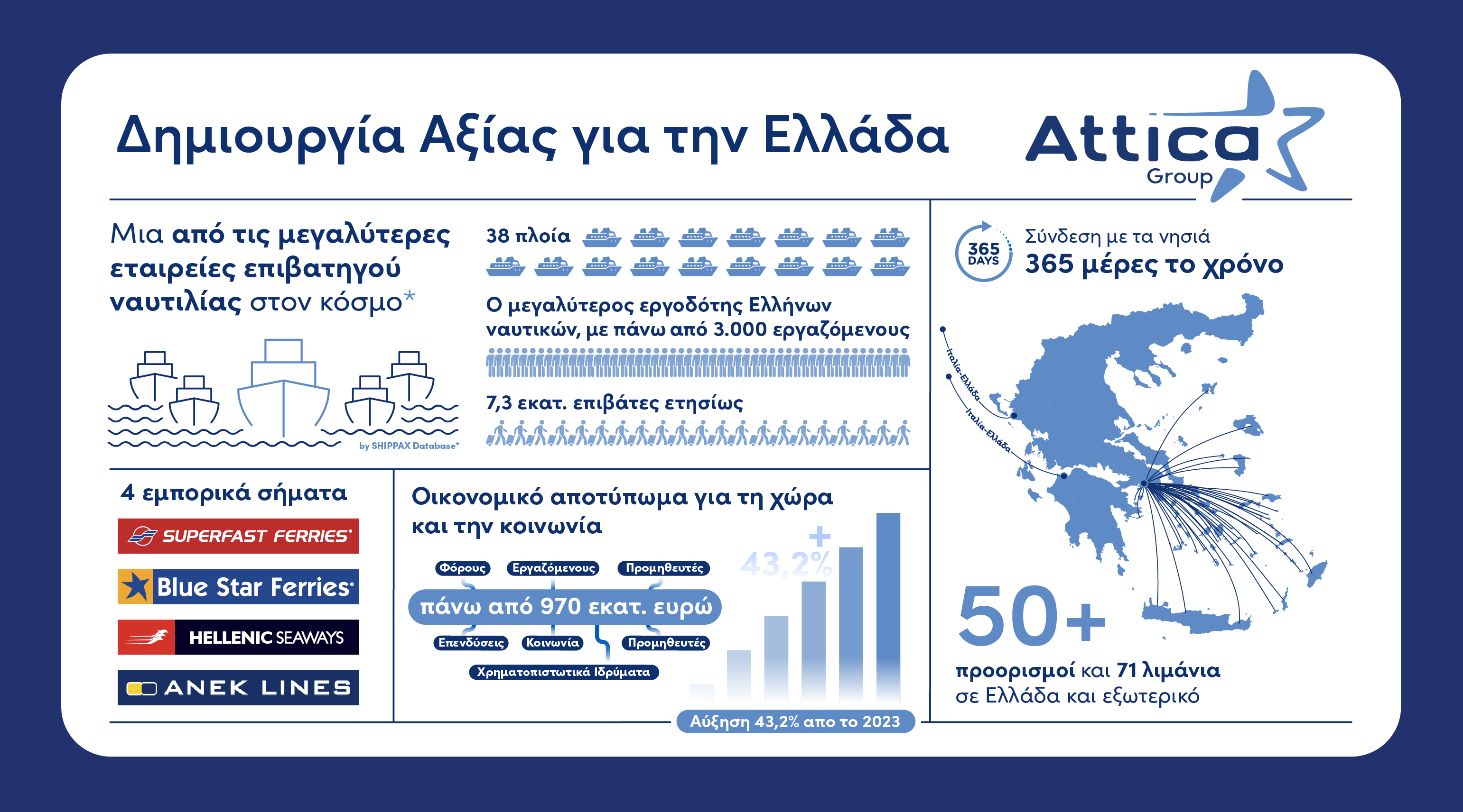 Σε αυτό το τοπίο κυριαρχεί η Αttica Group, η ηγέτιδα δύναμη της ελληνικής ακτοπλοΐας. Οι αριθμοί που περιγράφουν τις επιδόσεις της την κατατάσσουν στους μεγαλύτερους ομίλους του κλάδου παγκοσμίως, ενώ, μεταξύ άλλων, σύμφωνα με το SHIPPAX, αποτελεί τη μεγαλύτερη εταιρεία επιβατηγού ναυτιλίας, διεθνώς, βάσει της χωρητικότητας επιβατών.
