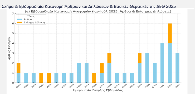 Η ανάλυση βασίστηκε στη συλλογή και επεξεργασία αναφορών από ειδησεογραφικές πηγές και κυβερνητικές δηλώσεις για την εξεταζόμενη περίοδο, οι οποίες κατηγοριοποιήθηκαν σε άρθρα και επίσημες τοποθετήσεις. Οι αναφορές ομαδοποιήθηκαν σε εβδομαδιαία και μηνιαία βάση, προκειμένου να αποτυπωθεί η ένταση και η χρονική κλιμάκωση της δημόσιας συζήτησης ενόψει της ΔΕΘ.