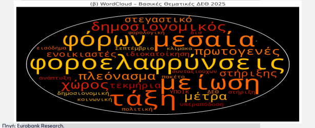 Σε στοχευμένη ανάλυση δημοσιογραφικών αναφορών και επίσημων δηλώσεων για το διάστημα Ιανουάριος - Ιούλιος 2025, που καταδεικνύει τις κυρίαρχες θεματικές και το δημοσιονομικό πλαίσιο των επικείμενων εξαγγελιών στη ΔΕΘ, προχώρησε η Eurobank.