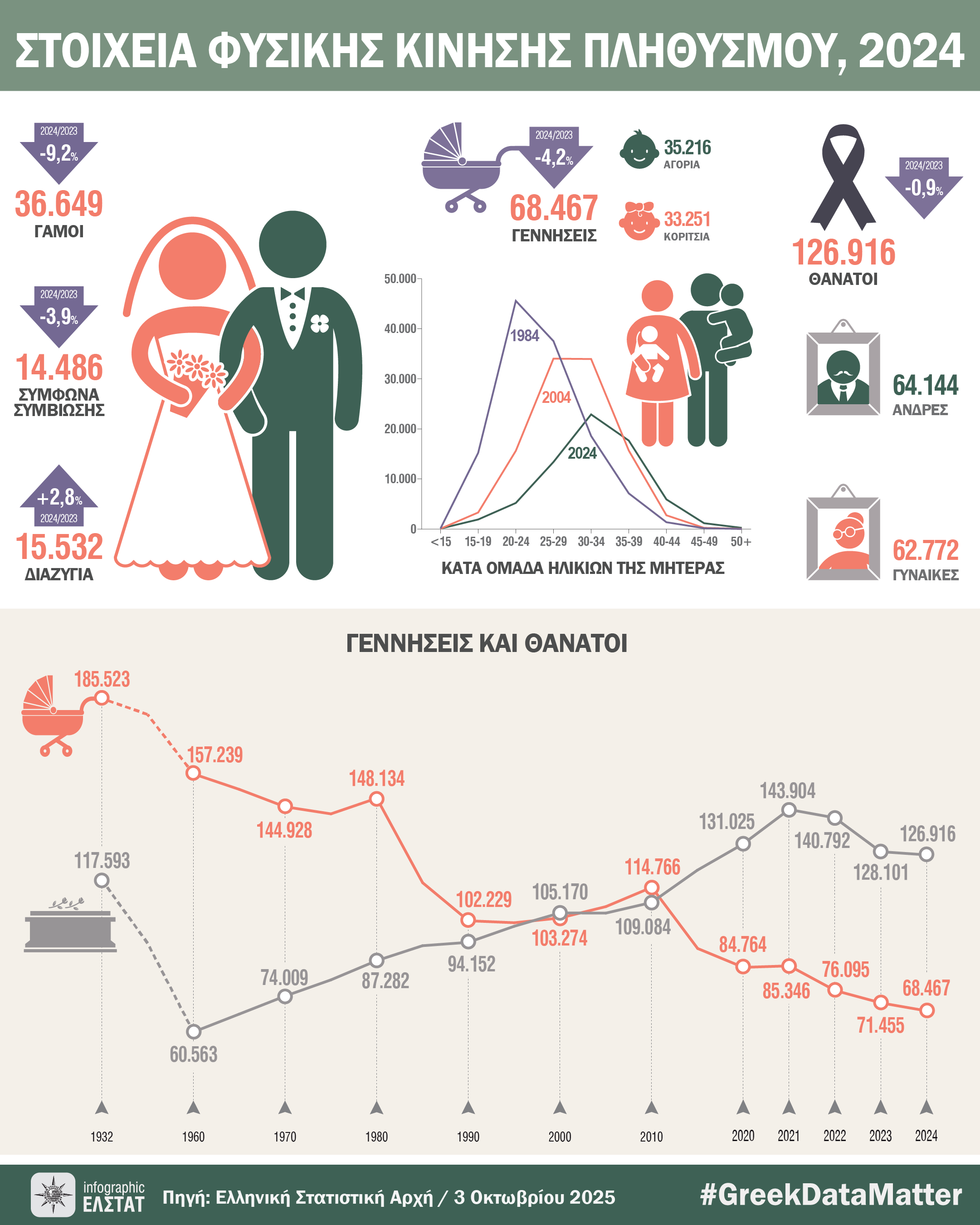 • Σύμφωνα με τα στοιχεία αυτά, οι γεννήσεις στην Ελλάδα κατά το 2024 ανήλθαν σε 68.467 (35.216 αγόρια και 33.251 κορίτσια) καταγράφοντας μείωση κατά 4,2% σε σχέση με το 2023 που ήταν 71.455 (36.622 αγόρια και 34.833 κορίτσια). Στις γεννήσεις δεν συμπεριλαμβάνονται οι γεννήσεις νεκρών, οι οποίες κατά το 2024 ανήλθαν σε 454, αυξημένες κατά 5,1% σε σχέση με το 2023 που ήταν 432.