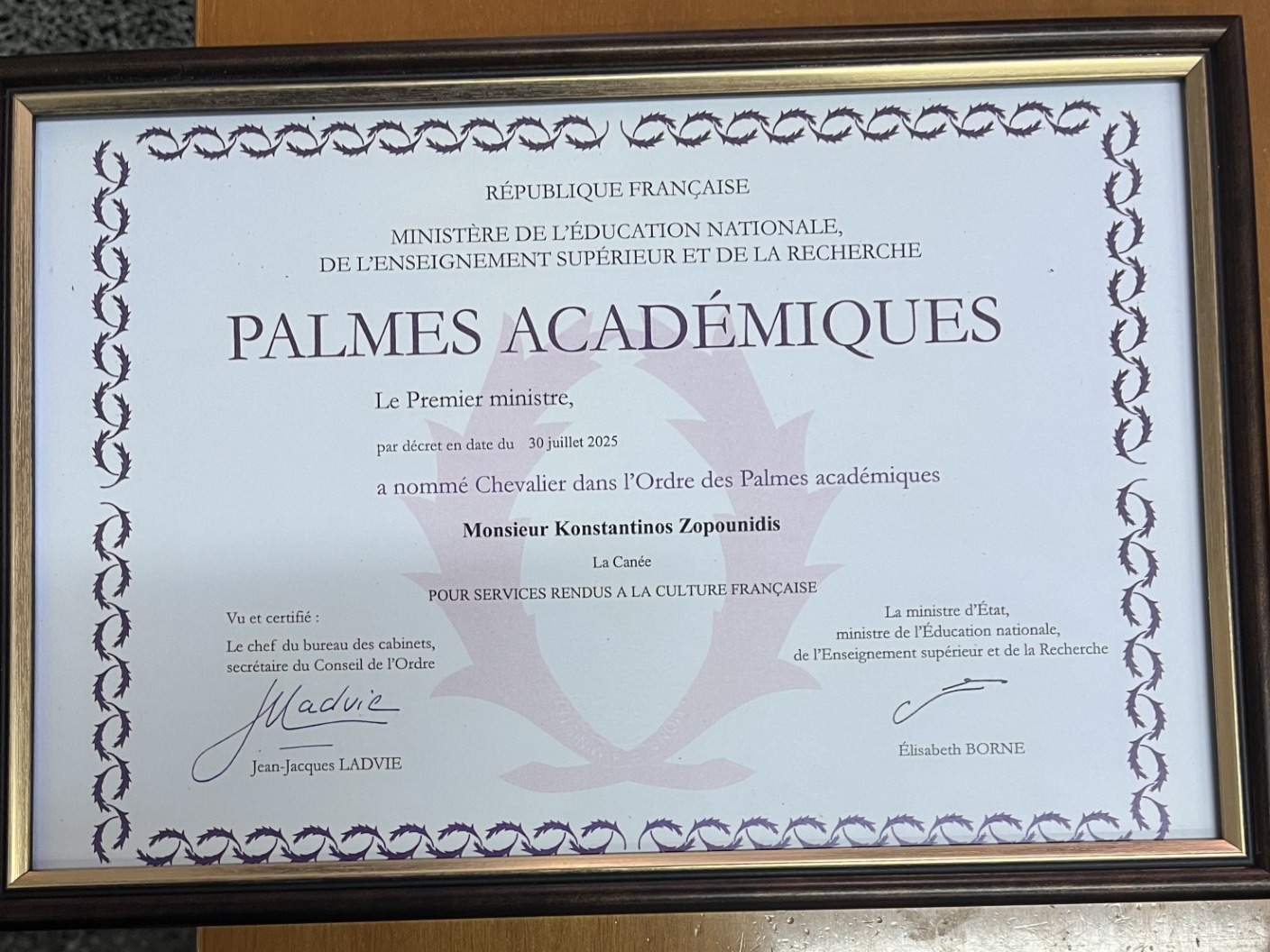 Η απονομή των Palmes Academiques γίνεται σε μια επίσημη τελετή που βασίζεται στην παράδοση. Ο Καθηγητής Κωνσταντίνος Ζοπουνίδης θα παρασημοφορηθεί για το έργο του στη Χρηματοοικονομική Διοίκηση και το Μάνατζμεντ.