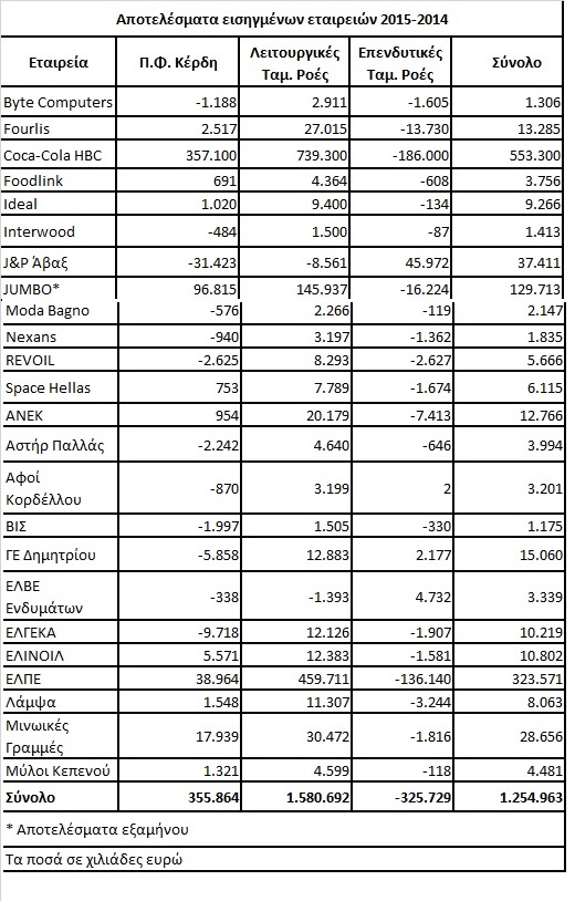 Με βάση λοιπόν τα στοιχεία του παρατιθέμενου πίνακα, οι 25 εισηγμένες εμφάνιζαν αθροιστικά προ φόρων κέρδη ύψους 255,86 εκατ. ευρώ, ενώ ταυτόχρονα παρήγαγαν υπερτριπλάσιες θετικές ταμειακές ροές (1,254 δισ. ευρώ).