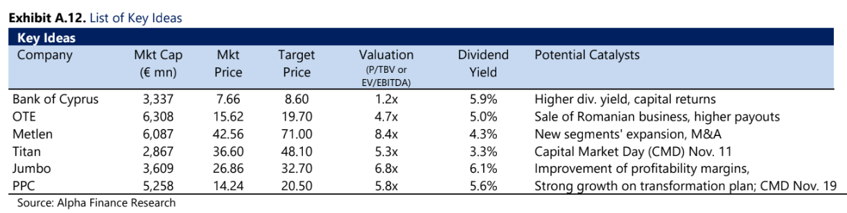 Η Alpha Finance τονίζει ότι προτιμά μη τραπεζικές μετοχές, θεωρώντας ότι μπορούν να επιδείξουν ανθεκτικότητα και υπεραπόδοση ακόμη και σε περιβάλλον αυξημένης μεταβλητότητας. Παράλληλα, βλέπει σημαντικά περιθώρια ανόδου στις εταιρείες με προοπτικές διεθνοποίησης, υψηλές ταμειακές ροές και συνεπή μερισματική πολιτική.