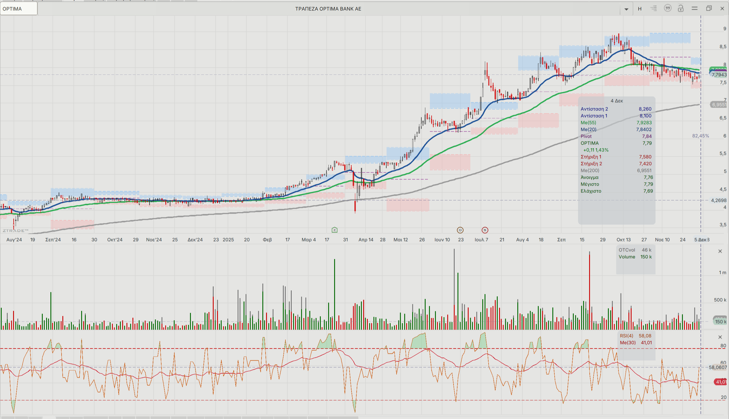 Από τα 2,40 ευρώ στα 9 ευρώ περίπου, η μετοχή της Optima Bank έχει διορθώσει κατά ένα ευρώ και προσεγγίζει πλέον τη στήριξη των 7,40 ευρώ η οποία είναι ισχυρή.