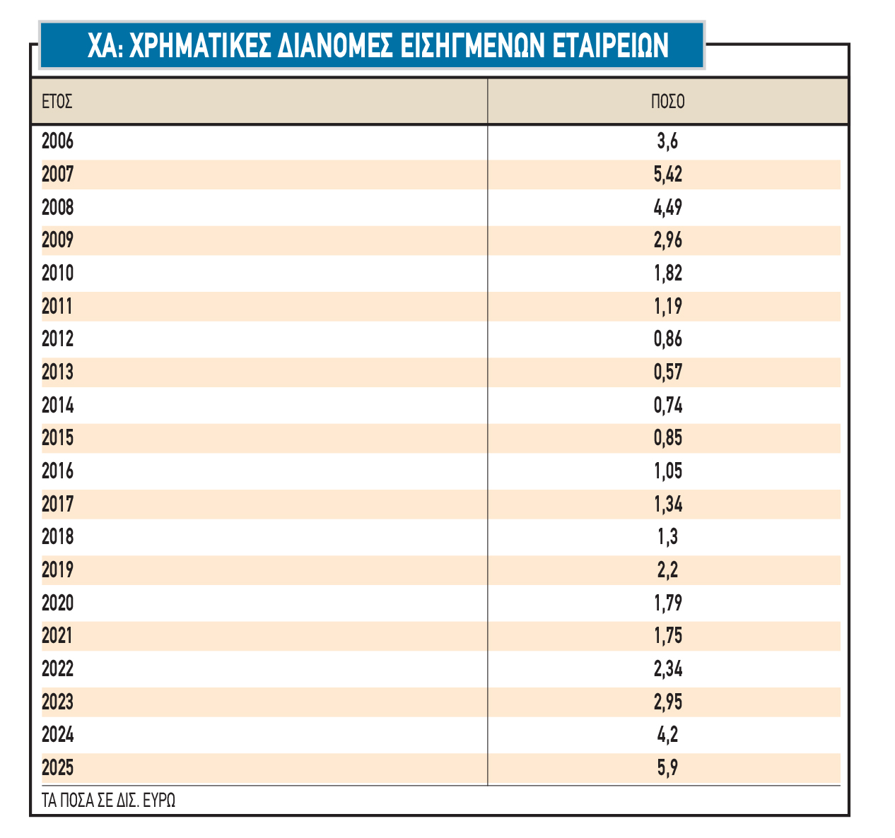5. Παρά το γεγονός ότι ο Γενικός Δείκτης του ΧΑ έχει κερδίσει περίπου 170% κατά την τελευταία πενταετία, το μέσο P/E των εισηγμένων μετοχών διαμορφώνεται γύρω στο 12,5 (κεφαλαιοποίηση στα 145 δισ. ευρώ, εκτιμώμενα φετινά εταιρικά κέρδη πλησίον ή και υψηλότερα των 11,5 δισ. ευρώ) και η μέση μερισματική απόδοση κοντά στο 4% (σύνολο φετινών χρηματικών διανομών στα 5,9 δισ. ευρώ, βλέπε στοιχεία σχετικού παρατιθέμενου πίνακα). Οι μέσοι αυτοί δείκτες δεν αντανακλούν φαινόμενα «φούσκας», ενώ παράλληλα είναι ελκυστικότεροι σε σύγκριση με το εξωτερικό.