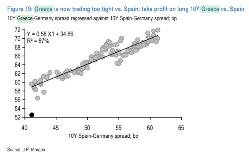 Στο τελευταίο Global Fixed Income Markets Weekly, η JP Morgan συστήνει ρητά λήψη κερδών (take profit) στη θέση overweight στο 10ετές ελληνικό ομόλογο έναντι της Ισπανίας, κίνηση που σηματοδοτεί μια πιο ουδέτερη στάση μετά το ισχυρό ράλι που έχει προηγηθεί.