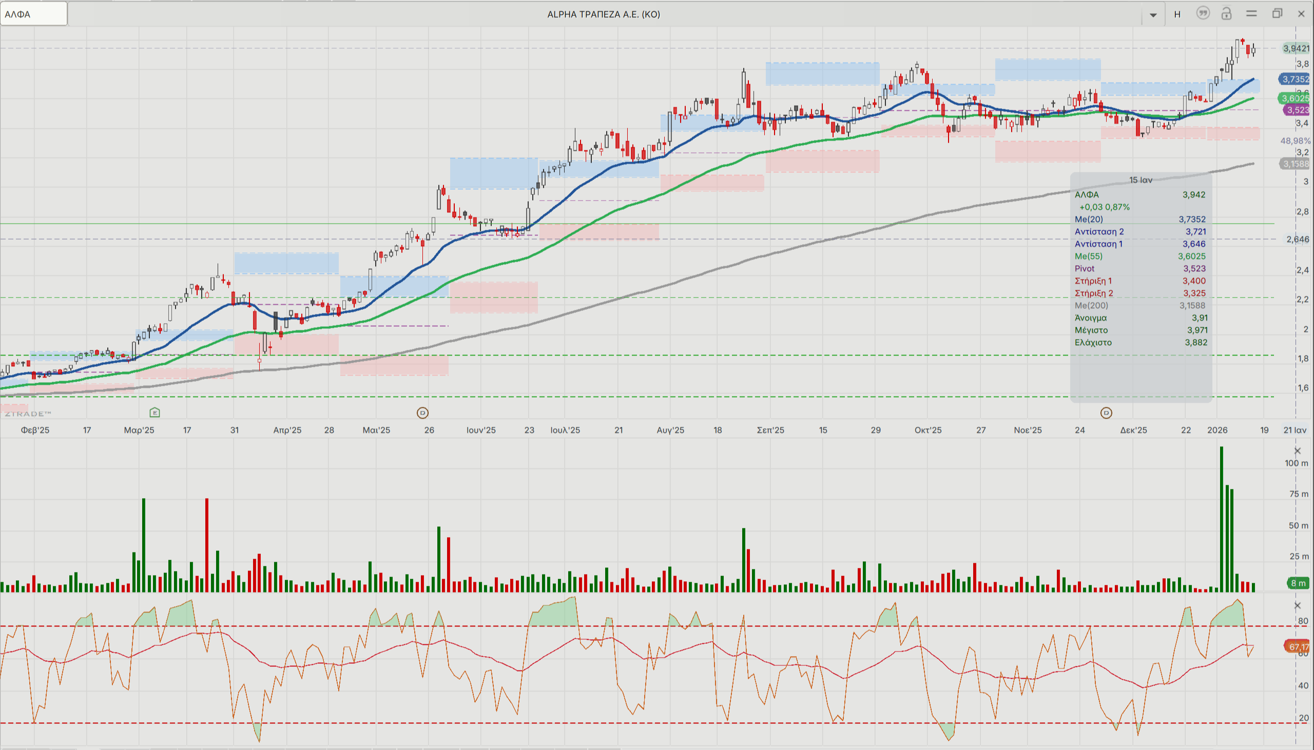 Η τρέχουσα περιοχή ισχυρής στήριξης πλέον είναι τα 3,75 ευρώ το οποίο θα κρίνει και πόσο γρήγορα θα διασπαστεί η αντίσταση των 4 ευρώ ανά μετοχή. Ο ταλαντωτής RSI 14 εβδομάδων δείχνει ότι είναι σε υπεραγορασμένα επίπεδα.