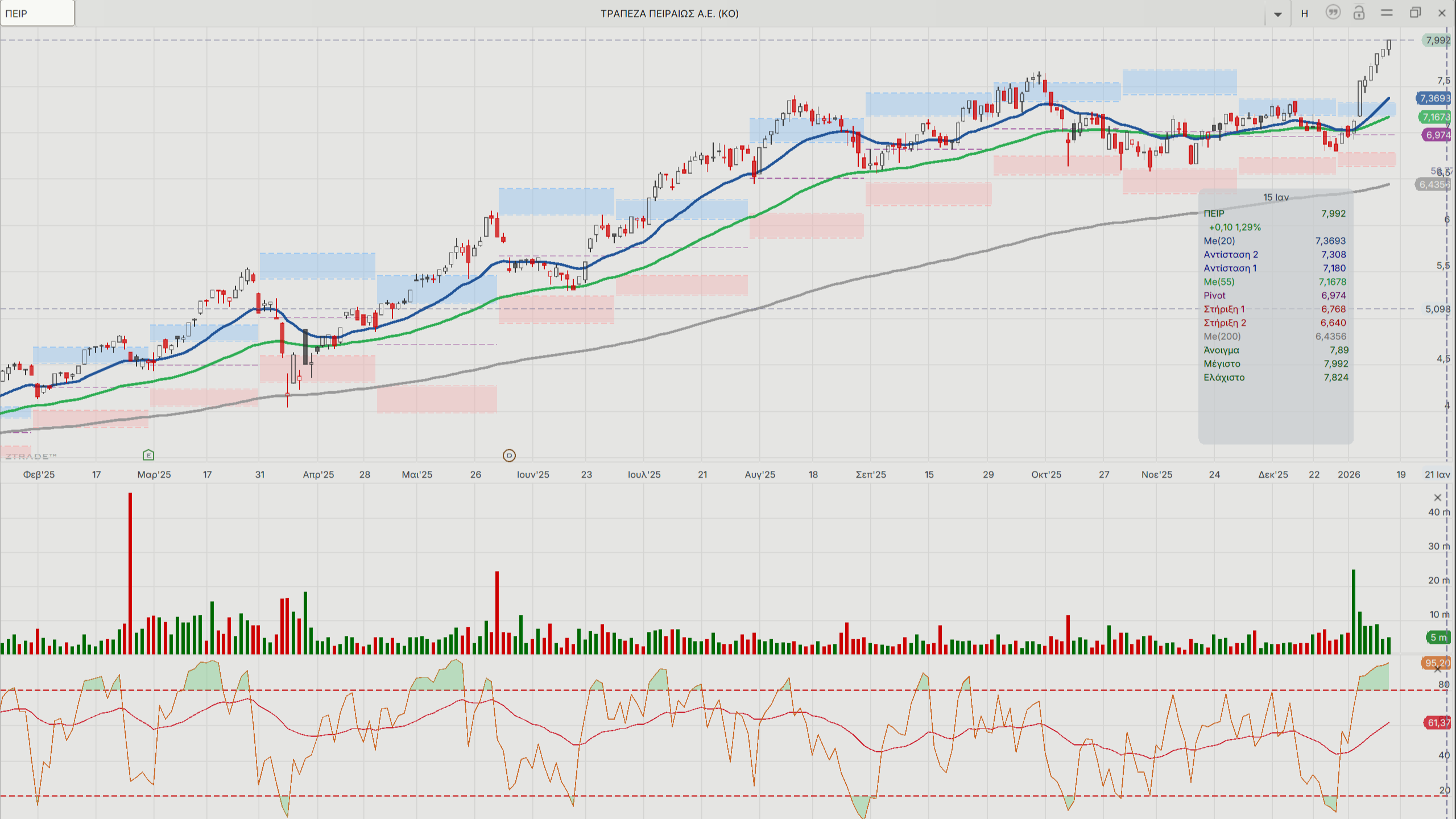 H κίνηση στη μετοχή της Τράπεζας Πειραιώς είναι σε ακόμα πιο ανοδική φάση στο ημερήσιο διάγραμμα, αφού από τα 7 ευρώ στις αρχές του χρόνου έχει βρεθεί στα 8 ευρώ σε διάστημα λίγων ημερών, γεγονός που δείχνει ότι ίσως η μετοχή της Alpha Βank να έχει μείνει λίγο πίσω σε σχετικούς όρους.