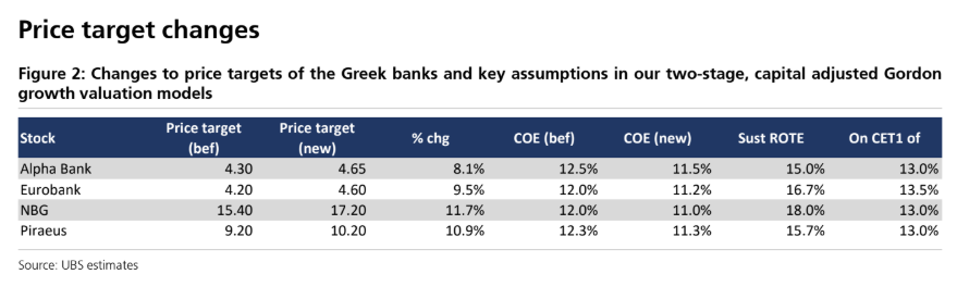 Η UBS προχώρησε σε αύξηση των τιμών-στόχων κατά 8%-12%, μετά τη μετακύλιση των αποτιμήσεων, τη μείωση του κόστους ιδίων κεφαλαίων (COE) και την εφαρμογή μοντέλου δύο σταδίων Gordon Growth, προσαρμοσμένου στο κεφάλαιο.