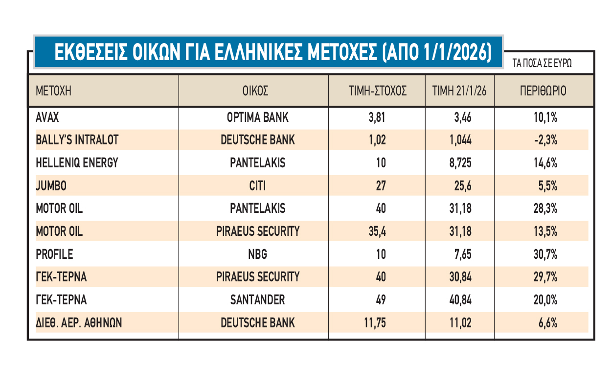 Ενδεικτικά είναι τα στοιχεία του παρατιθέμενου πίνακα, σχετικά με τις τιμές-στόχους σε εκθέσεις που δημοσιεύτηκαν μέσα στο 2026. Με βάση την τρέχουσα χρηματιστηριακή αξία των 152,6 δισ. ευρώ (κλείσιμο 21/1/2026) το μέσο P/E του ΧΑ με βάση τα εκτιμώμενα κέρδη του 2025 (τουλάχιστον 11,5 δισ. ευρώ) υπολογίζεται κοντά στο 13 και η μέση μερισματική απόδοση (περυσινές χρηματικές διανομές έξι δισ. ευρώ) γύρω στο 3,9% (πάνω από το yield των δεκαετών κρατικών ομολόγων).