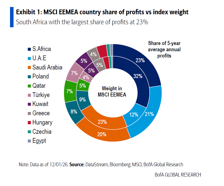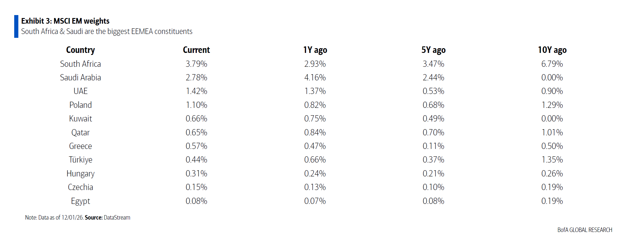 Σύμφωνα με τα στοιχεία της BofA, η στάθμιση της Ελλάδας στον MSCI EEMEA ανέρχεται στο 0,57%, αυξημένη σε σχέση με το παρελθόν, γεγονός που αντανακλά τόσο την άνοδο των αποτιμήσεων όσο και τη βελτίωση της επενδυτικής εικόνας της αγοράς. Παράλληλα, η Ελλάδα συγκαταλέγεται στις αγορές με υψηλό μερίδιο κερδοφορίας σε σχέση με το βάρος της στον δείκτη, στοιχείο που ενισχύει το επενδυτικό αφήγημα.