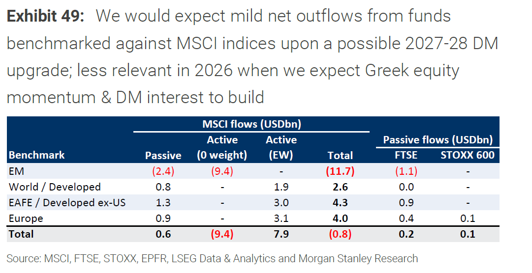 Η αλληλουχία των γεγονότων (FTSE με εφαρμογή τον Σεπτέμβριο 2026, επανεξέταση από STOXX την άνοιξη 2026 και πιθανή διαβούλευση από MSCI) αυξάνει τη «διαφημιστική πινακίδα» της αγοράς, αλλά η Morgan Stanley είναι σαφής: για FTSE και STOXX οι παθητικές ροές εκτιμώνται μικρές. Στο τραπέζι μπαίνει σοβαρά η MSCI, και εκεί η εικόνα γίνεται πιο σύνθετη και όχι απαραίτητα θετική.