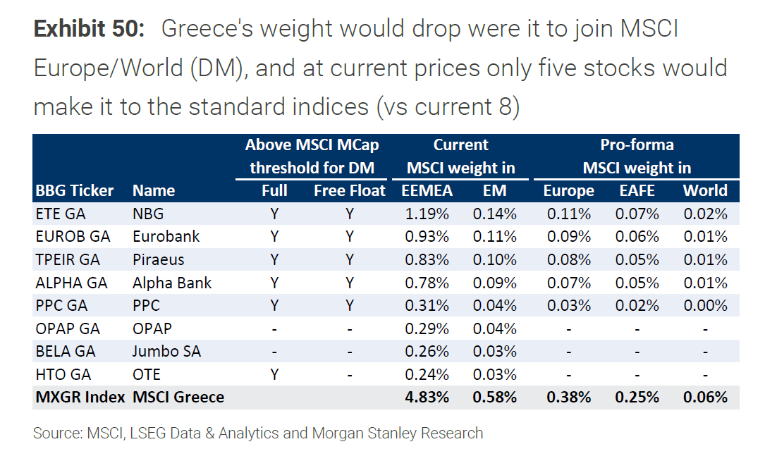 Αν η Ελλάδα μετακινηθεί από το οικοσύστημα των αναδυόμενων αγορών στις αναπτυγμένες αγορές, το βάρος της μέσα στους δείκτες μειώνεται αισθητά. Η Morgan Stanley δείχνει ότι, με τις τρέχουσες τιμές, μόνο πέντε μετοχές θα περνούσαν το κατώφλι για τους standard DM δείκτες, έναντι οκτώ που απαρτίζουν σήμερα το καλάθι του MSCI Greece στη λογική που εξετάζεται. Οι πέντε που «μένουν μέσα» είναι οι: Εθνική Τράπεζα, Eurobank, Τράπεζα Πειραιώς, Alpha Bank και ΔΕΗ.