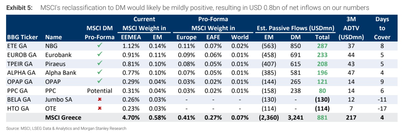 Από την οπτική των παθητικών ροών, η ανάλυσή μας υποδηλώνει ότι μια ανακατάταξη σε αναπτυγμένη θα ήταν πιθανώς ελαφρώς θετική, συνολικά περίπου 0,8 δισ. δολάρια καθαρές εισροές σύμφωνα με τους υπολογισμούς μας, αντισταθμίζοντας τις ανησυχίες σχετικά με εκροές από EM.