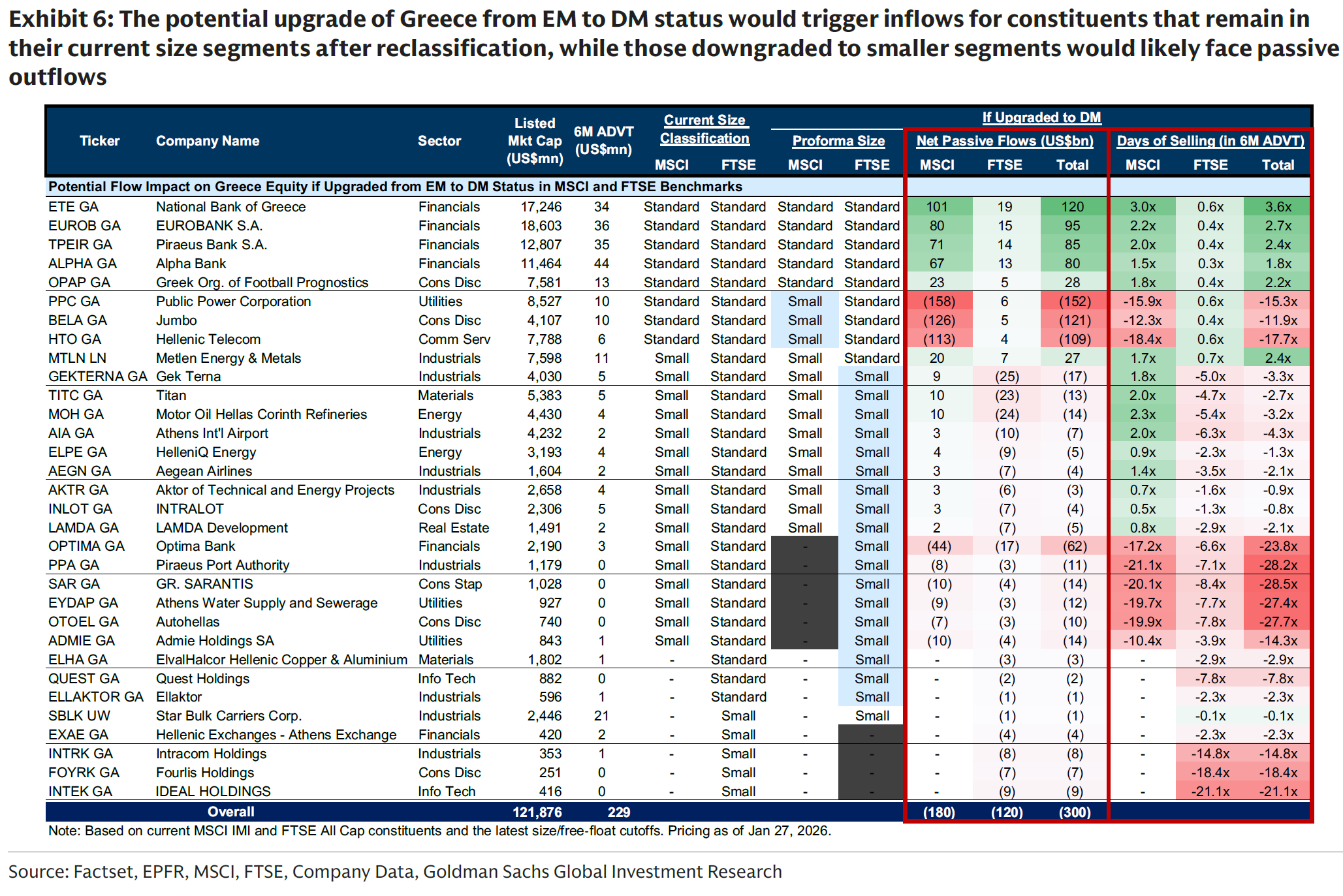 Το κρίσιμο στοιχείο της μετάβασης της Ελλάδας σε ανεπτυγμένη αγορά δεν είναι η ετικέτα, αλλά το πώς ανακατανέμεται το παθητικό χρήμα μετοχή προς μετοχή. Η Goldman Sachs εξηγεί τις ροές στις μετοχές, ποιοι τίτλοι κρατούν μέγεθος και ρευστότητα, ποιοι υποβιβάζονται και ποιοι μένουν εκτός του βασικού χάρτη των δεικτών.