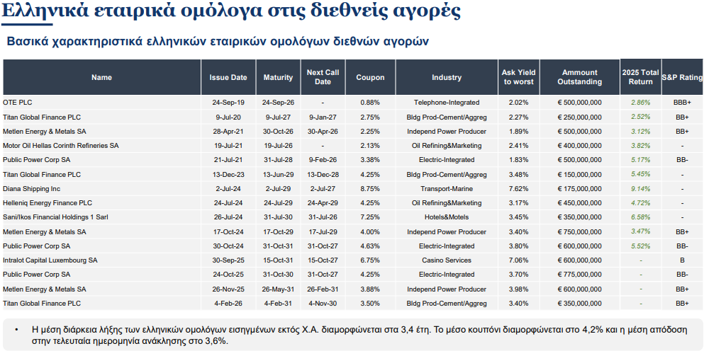 Η τράπεζα επισημαίνει ότι η ελκυστικότητα των ελληνικών τίτλων βασίζεται στα υψηλά έσοδα, τα βελτιωμένα θεμελιώδη στοιχεία των επιχειρήσεων και την ισχυρή ζήτηση από τους επενδυτές.