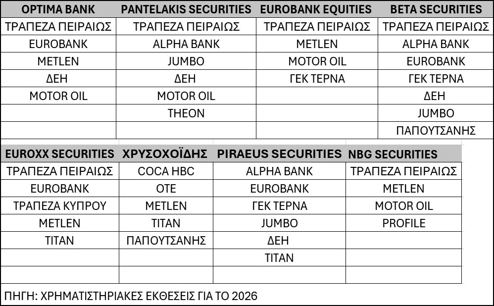 Φέτος, ο τραπεζικός κλάδος εξακολουθεί να αποτελεί τον βασικό άξονα των περισσότερων στρατηγικών με την Τράπεζα Πειραιώς να αναδεικνύεται ως η ισχυρότερη ψήφος εμπιστοσύνης της αγοράς, καθώς περιλαμβάνεται στις κορυφαίες επιλογές των Optima Bank, Pantelakis Securities, Eurobank Equities, Beta Securities, Euroxx Securities και NBG Securities. Οι αναλυτές εστιάζουν στη βελτίωση της ποιότητας των κερδών, στην κεφαλαιακή ενίσχυση και, κυρίως, στη σταδιακή ενίσχυση των διανομών προς τους μετόχους, στοιχείο που αλλάζει ουσιαστικά το επενδυτικό προφίλ της τράπεζας.