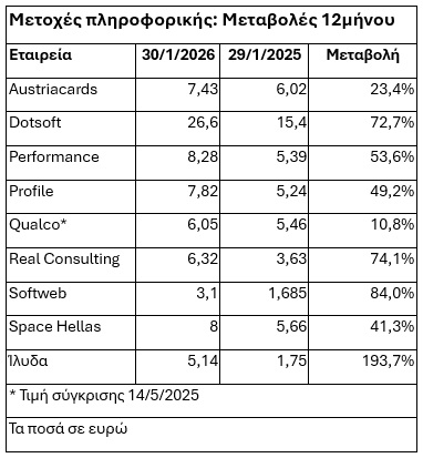 Οι μετοχές πληροφορικής παραμένουν σε υψηλά επίπεδα λόγω των προσδοκιών για δυνατές οικονομικές επιδόσεις το 2026, αύξηση deals και έντονου θεσμικού ενδιαφέροντος. Οι τιμές έχουν αυξηθεί άνω του 50% σε ένα έτος, με σημαντικές τοποθετήσεις σε εταιρείες όπως Profile και Qualco.