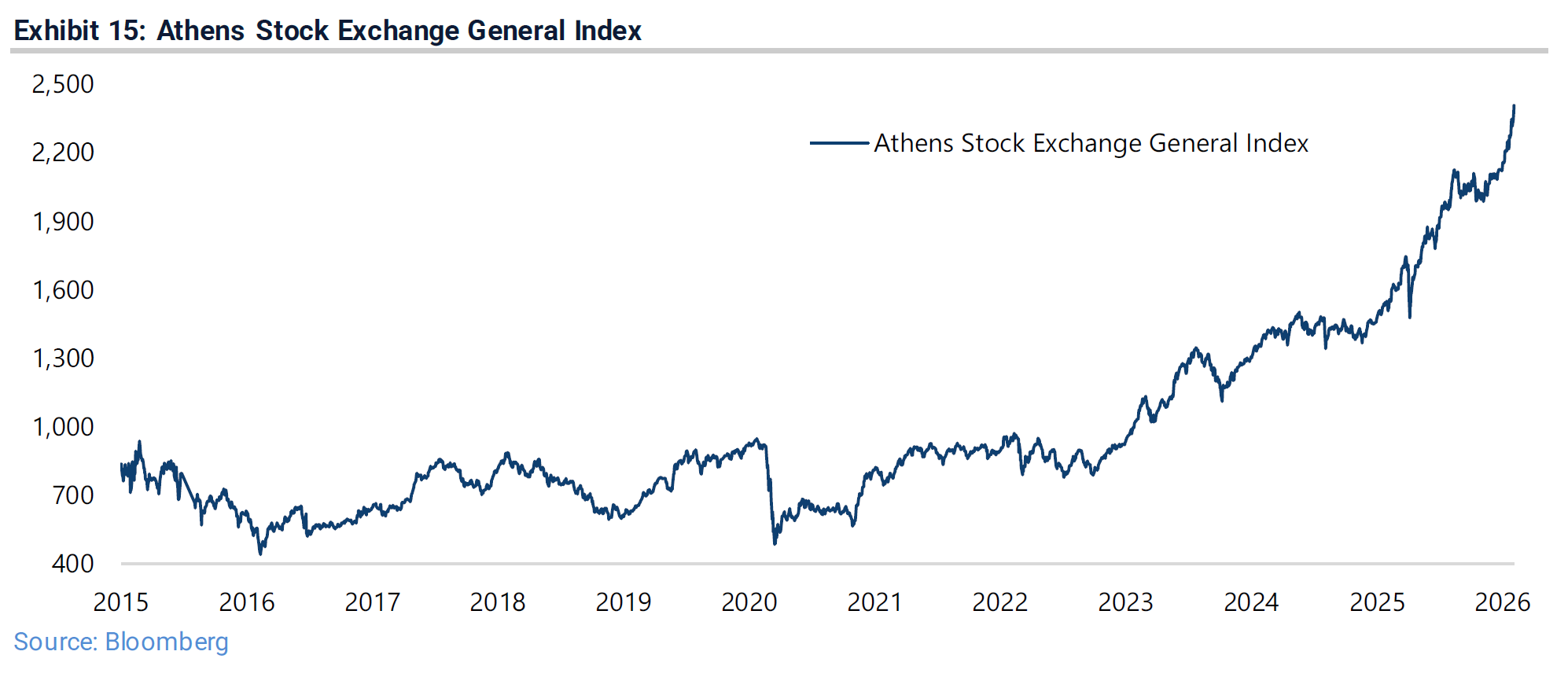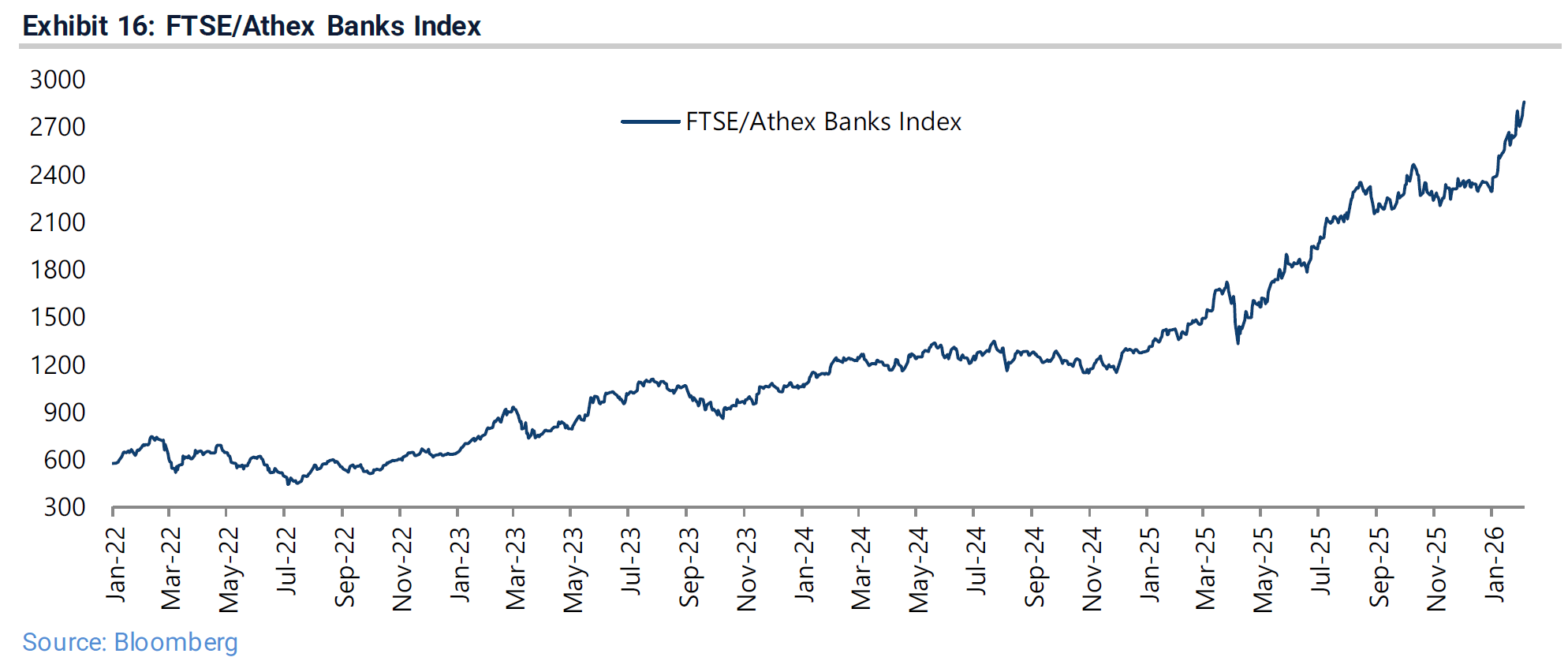 Σύμφωνα με τον οίκο, η ελληνική οικονομία εξακολουθεί να ξεχωρίζει στην Ευρώπη ως παράδειγμα μεταρρυθμιστικής προσαρμογής και επενδυτικής επιστροφής. Η πορεία του χρηματιστηρίου αποτυπώνει τη μεταβολή αυτή: ο Γενικός Δείκτης έχει ενισχυθεί κατά περίπου 266% από την περίοδο της πανδημίας, όταν οι αναλυτές άρχισαν να τοποθετούνται θετικά στη χώρα.