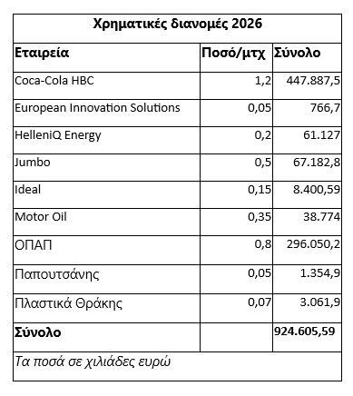Θα πρέπει να σημειωθεί ότι αυτές οι εταιρείες -με εξαίρεση την Coca-Cola HBC- αναμένεται να προχωρήσουν και σε μία ακόμη χρηματική διανομή προς τους μετόχους μέσα στο 2026, μετά από αποφάσεις που θα λάβουν οι ετήσιες τακτικές γενικές τους συνελεύσεις.