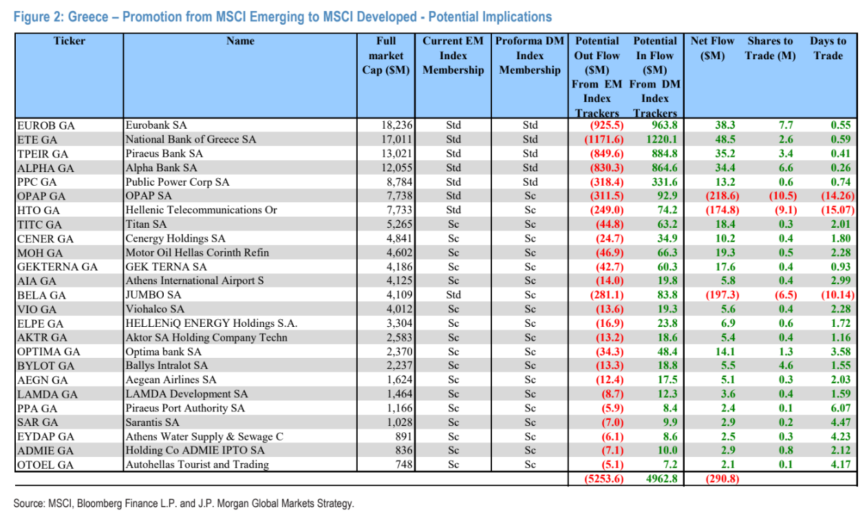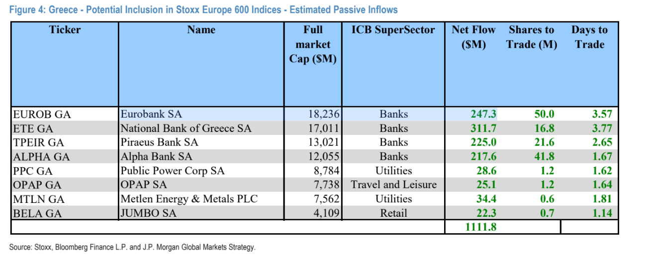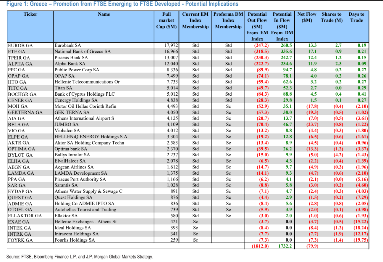Σύμφωνα με την JP Morgan, η αναβάθμιση δεν αποτελεί ένα μεμονωμένο γεγονός αλλά μια διαδοχική διαδικασία: αρχικά αλλάζει η επενδυτική βάση μέσω FTSE, στη συνέχεια πραγματοποιείται τεχνική αναδιάρθρωση μέσω MSCI και τελικά εμφανίζονται νέες εισροές από ευρωπαϊκά χαρτοφυλάκια μέσω STOXX, με τον τραπεζικό κλάδο να συγκεντρώνει το μεγαλύτερο μέρος των κεφαλαίων.