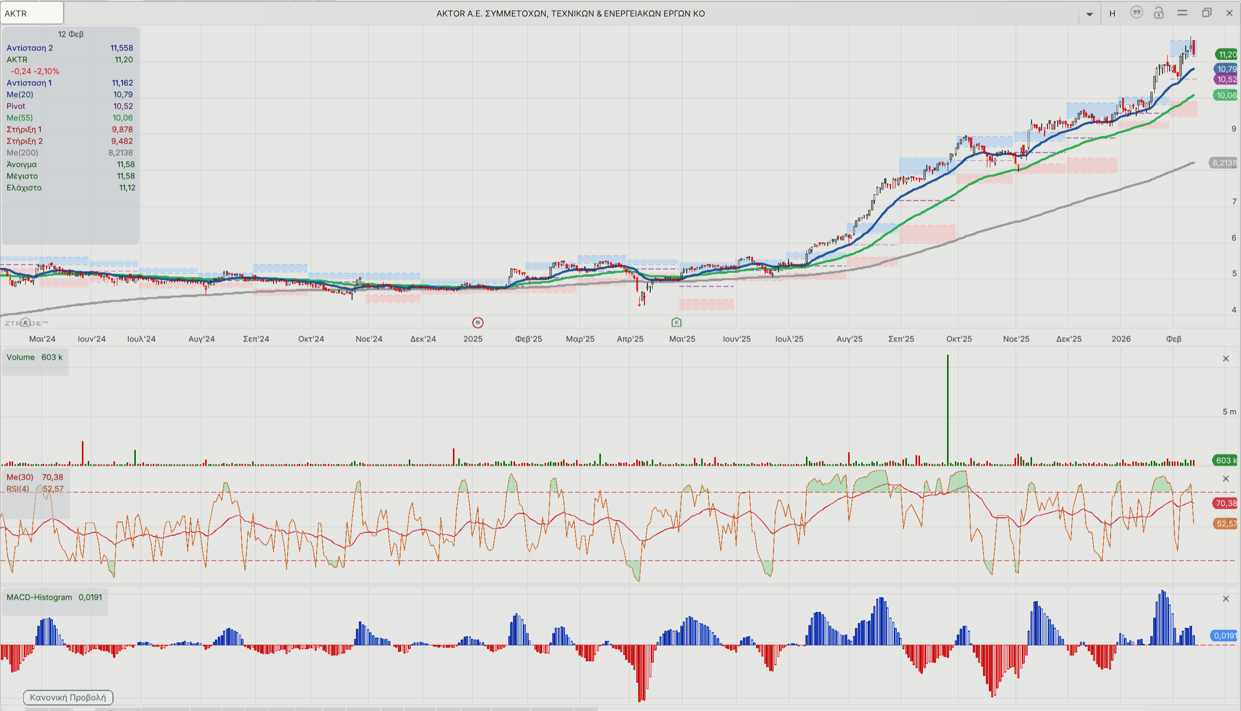 Για τη μετοχή του AKTOR, η τεχνική εικόνα δείχνει σταθερή ανοδική πορεία και βρίσκεται σε λιγότερη υπεραγορασμένη κατάσταση σε σχέση με τη ΓΕΚ ΤΕΡΝΑ. Τα κύρια τεχνικά στοιχεία δείχνουν ότι τάση είναι με παρόμοιο τρόπο «εκρηκτική» όπως στη ΓΕΚ ΤΕΡΝΑ από τα 5 με 6 ευρώ μέσα στο 2025, με breakout από τη συσσώρευσης στα 5 με 8 ευρώ και σταθερά ανοδική κίνηση έκτοτε.