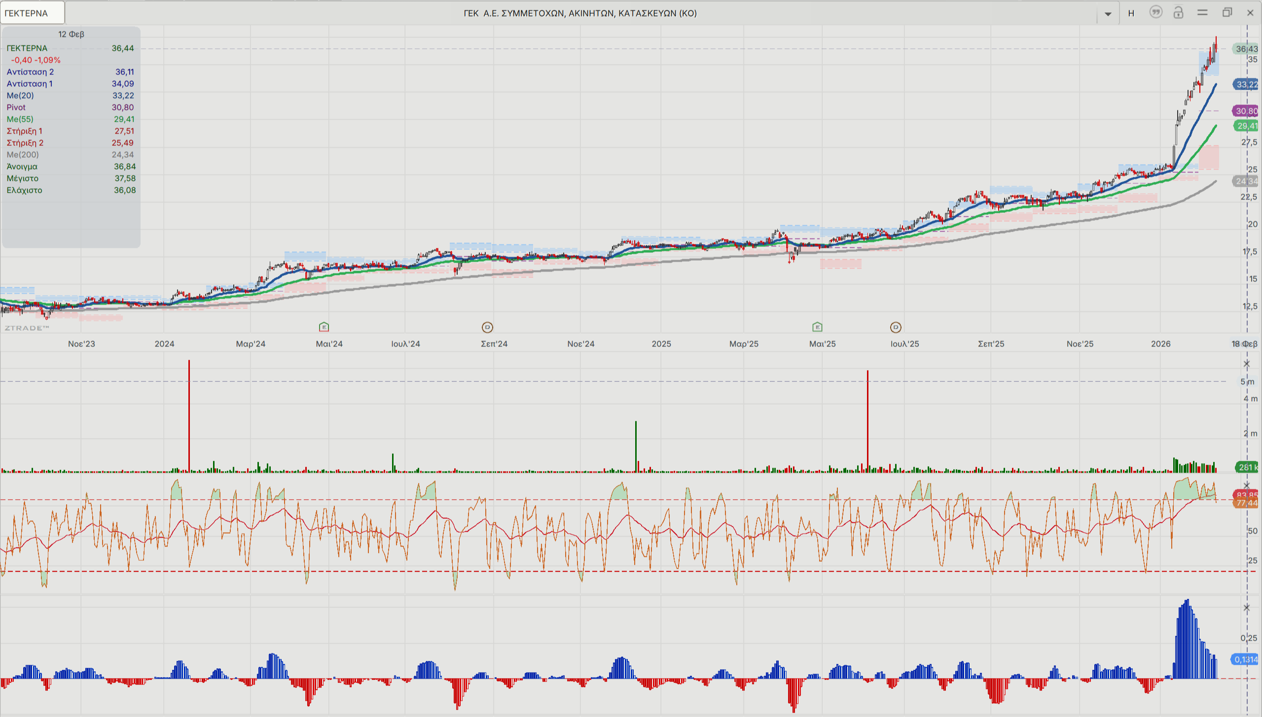 Σε τεχνικούς όρους, η μακροπρόθεσμη τάση είναι ισχυρά ανοδική και η μετοχή βρίσκεται σε μακροχρόνιο ανοδικό κανάλι τιμών (uptrend channel) από τα χαμηλά των 12-15 ευρώ (2023-2024). Το μηνιαίο γράφημα δείχνει παρατεταμένη φάση συσσώρευσης το 2024 έως τα μέσα του 2025 (18 με 22 ευρώ), ακολουθούμενη από explosive breakout από τα 25-27 ευρώ προς τα τέλη 2025 και κάθετη άνοδο άνοδο το 2026.
