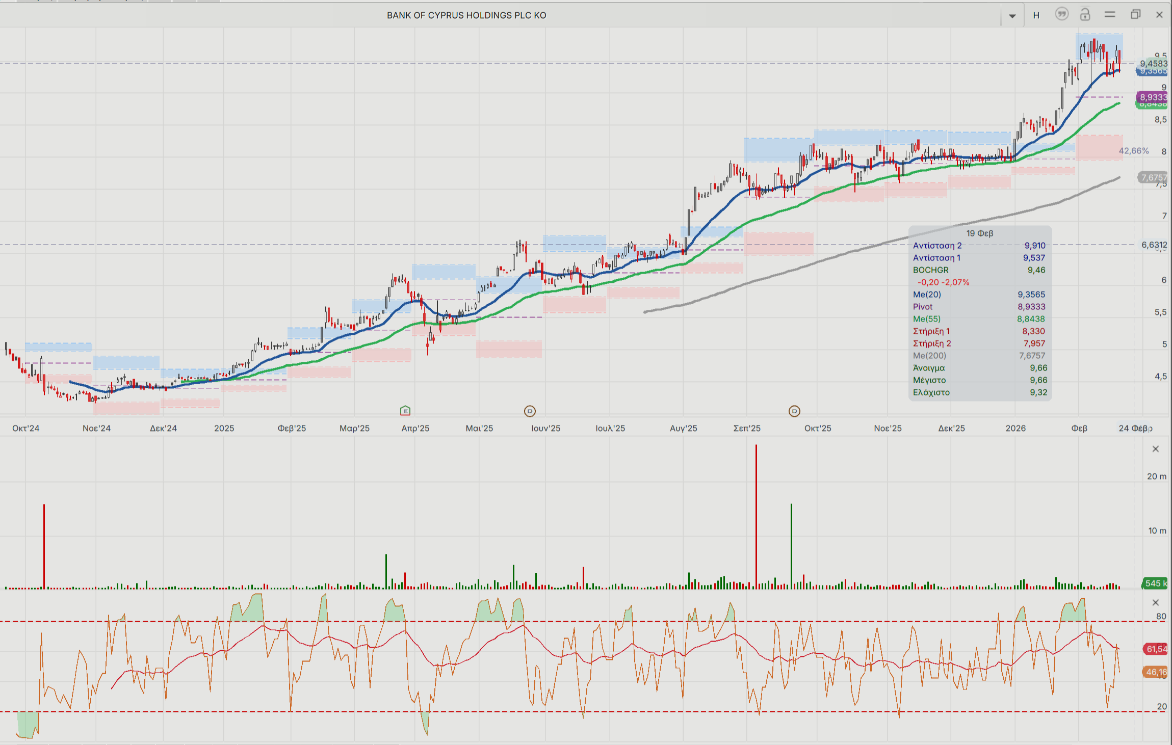 Οι εκθετικοί κινητοί μέσοι όροι ενισχύουν το θετικό σενάριο. Ο EMA20 κινείται πέριξ των 9,20 ευρώ, ο EMA55 στα 8,35 ευρώ και ο EMA200 στα 7,89 ευρώ, σε πλήρη ανοδική διάταξη, λειτουργώντας ως δυναμικές στηρίξεις. Η άμεση στήριξη εντοπίζεται στη ζώνη 9,20 με 9,30 ευρώ, ενώ ισχυρότερη βάση διαμορφώνεται μεταξύ 8,35 και 8,80 ευρώ.