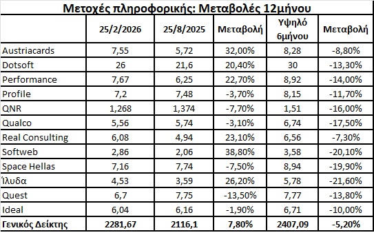 Όπως προκύπτει από τα στοιχεία του παρατιθέμενου πίνακα: α) Εταιρείες που δεν σχετίζονται σε αξιοσημείωτο βαθμό με έργα του δημοσίου (π.χ. Performance Technologies, Real Consulting) έχουν σημειώσει μεγάλη άνοδο στο ταμπλό κατά το τελευταίο εξάμηνο β) Αντίθετα, άλλες εισηγμένες που δραστηριοποιούνται ως ένα βαθμό στα δημόσια έργα (π.χ. Space Hellas, QNR, Prοfile και κατά ένα μέρος οι όμιλοι συμμετοχών Quest και Ideal μέσω θυγατρικών τους) έχουν δει κατά το ίδιο χρονικό διάστημα τις τιμές των μετοχών τους να υποχωρούν.