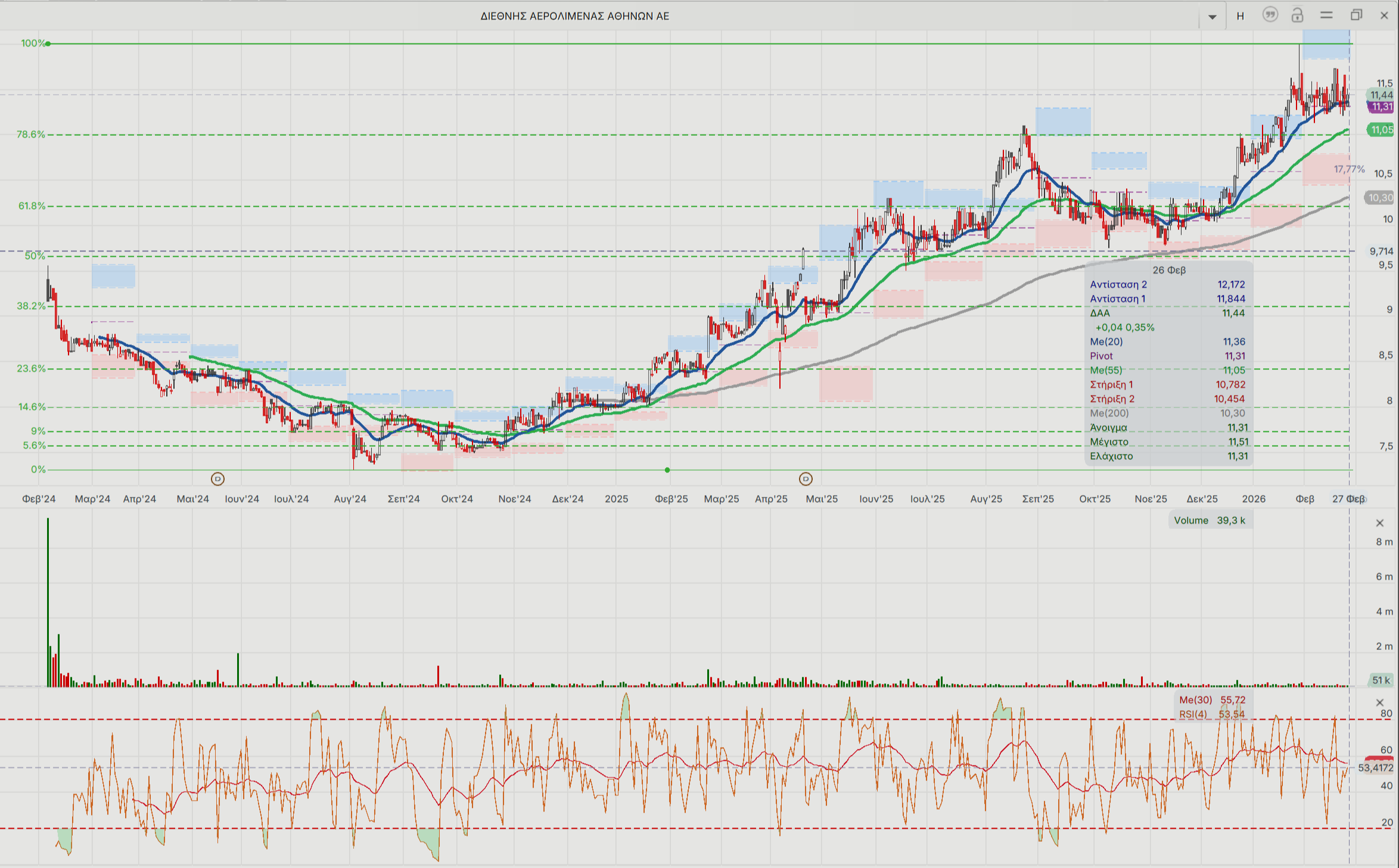 Στο ημερήσιο διάγραμμα, μετά το breakout από την περιοχή των 10 ευρώ στα τέλη του 2025, η μετοχή κατέγραψε νέα υψηλά στα 11,65 ευρώ. Η πρόσφατη διόρθωση βρήκε στήριξη στην περιοχή 11,05-11,30 ευρώ.