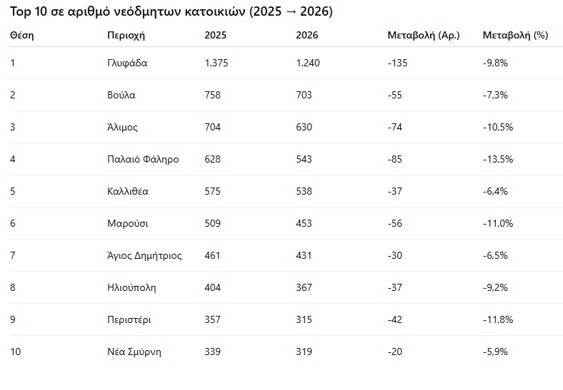 Στις νέες κατοικίες, τα στοιχεία παρουσιάζουν μια ενδιαφέρουσα εικόνα. Στον αριθμό των νεόδμητων παρουσιάζεται μείωση μέχρι και 13,5% σε όλες τις περιοχές που ανήκουν στο Top 10 της Prosperty.
