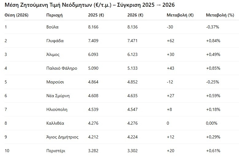 Σταθεροποίηση των τιμών παρατηρείται στα νεόδμητα διαμερίσματα τους πρώτους δύο μήνες του 2026, με οριακή μείωση να καταγράφεται στη Βούλα και το Μαρούσι, σύμφωνα με στοιχεία που ετοίμασε η Prosperty για το Euro2day.gr.