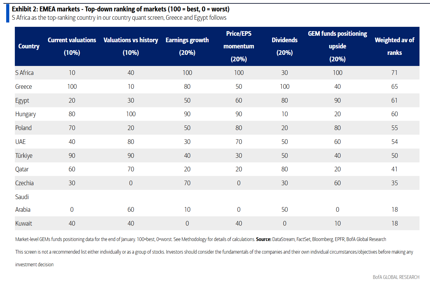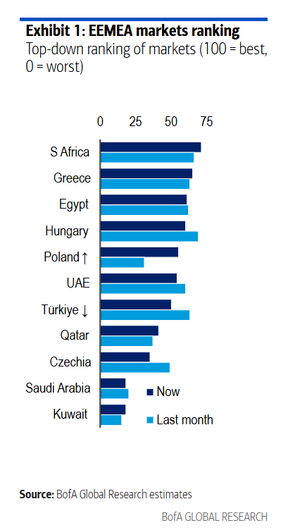 Στο μοντέλο αξιολόγησης αγορών της Bank of America, η Ελλάδα κατατάσσεται στη δεύτερη θέση μεταξύ των χωρών της περιοχής, πίσω μόνο από τη Νότια Αφρική και μπροστά από οικονομίες όπως η Αίγυπτος, η Ουγγαρία και η Πολωνία.